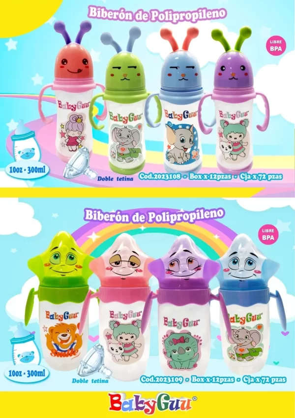 Este biberón de 10 onzas (300 ml) es una opción segura, ligera y divertida para la alimentación de tu bebé. Fabricado con polipropileno de alta calidad, es resistente y está certificado como libre de BPA. Los diseños únicos de la tapa, ya sea con orejas de conejo o en forma de estrella, captarán la atención del bebé y harán de cada comida un momento especial. Ambos modelos incluyen doble tetina para un flujo de leche adecuado y una alimentación cómoda.
